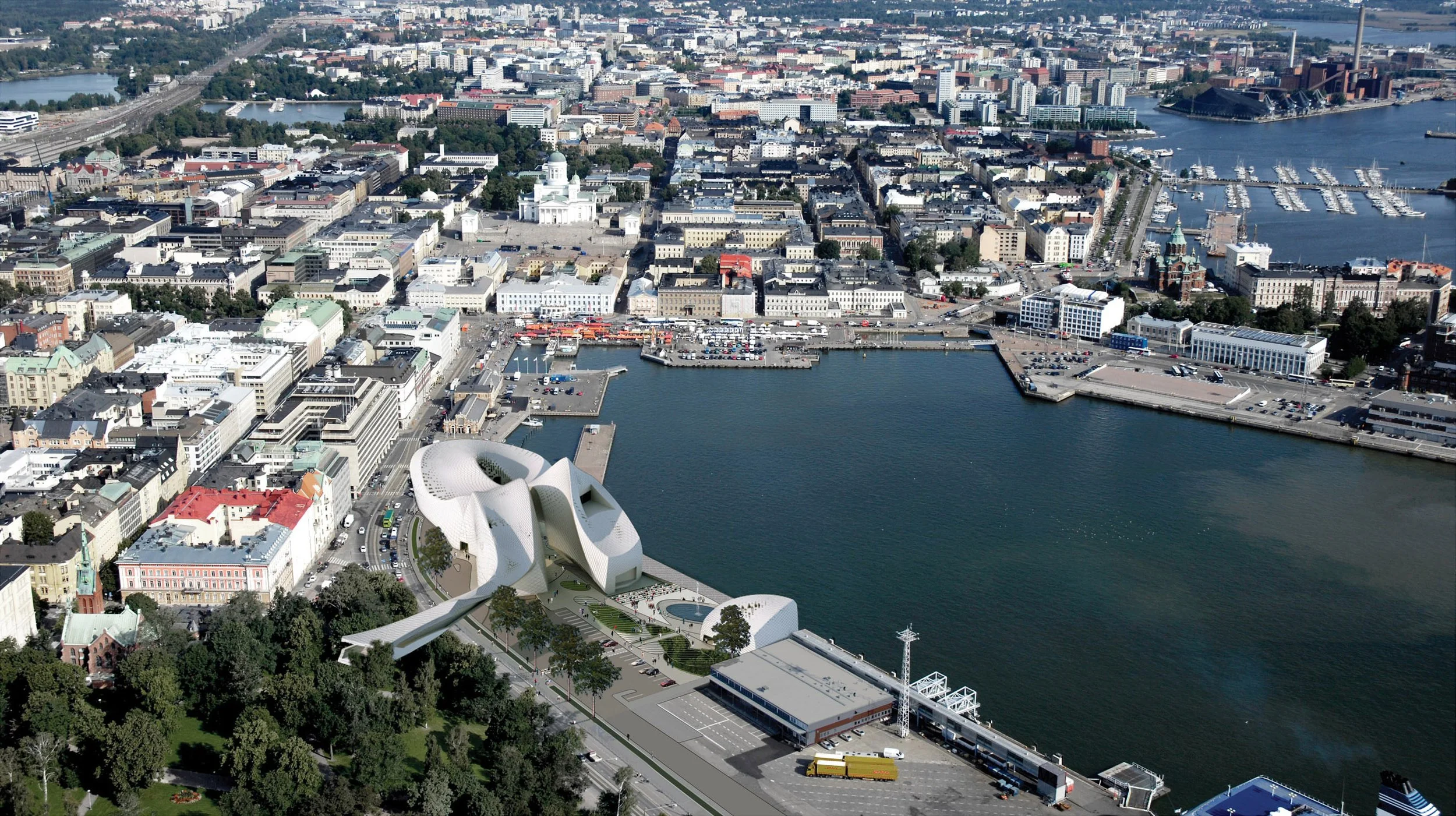 Our proposal for the Guggenheim Helsinki creates a new relationship between art and the city of Helsinki. Hovering over the ground, our museum creates a new urban space and art park with a multitude of public spaces at the edge of the Gulf of Finland. The building postures itself at the end of Eteläinen Makasiinkatu and frames a view to the harbor. As an iconic figure, the museum changes as one views it from the city, the park, the street, or the water. An inner street that ends in a courtyard and covered plaza parallels a renewed pedestrian path along the water’s edge, providing connections to the city while a new pedestrian bridge connects to the park beyond. The Northern face of the building cantilevers over the city, creating an iconic entry to invite visitors towards the inner courtyard & museum lobby. Part landscape and part urbanscape, an activated urban frontage recreates the water’s edge and reconnects the City to the water. Public amenities – including cafes, a design store, a black box theater, and an outdoor amphitheater – are interspersed throughout the outdoor exhibits in the art park, and create a new living room for the museum and the city at the edge of the South Harbor. Mediating between the scale of the harbor and the scale of the city, the Helsinki Guggenheim creates an unexpected waterfront place that will be a new nexus for the city.
